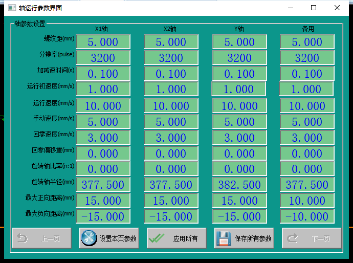 軸(zhou)(zhou)參數設置UVW平(ping)臺各軸(zhou)(zhou)的螺紋距(ju)(ju)、分辨率(lv)、加減速(su)時(shi)間、運(yun)行初速(su)度、運(yun)行速(su)度、手(shou)動速(su)度、回零(ling)速(su)度、回零(ling)偏移量、旋轉(zhuan)軸(zhou)(zhou)比率(lv)、旋轉(zhuan)軸(zhou)(zhou)半徑、最大正向(xiang)距(ju)(ju)離、最大負向(xiang)距(ju)(ju)離等參數。