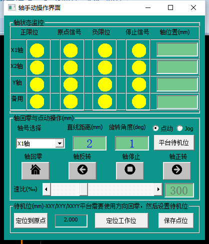 軸(zhou)回(hui)零(ling)與點(dian)動操(cao)(cao)作:選擇(ze)軸(zhou)號,單軸(zhou)回(hui)零(ling),軸(zhou)正反(fan)轉,點(dian)動操(cao)(cao)作。