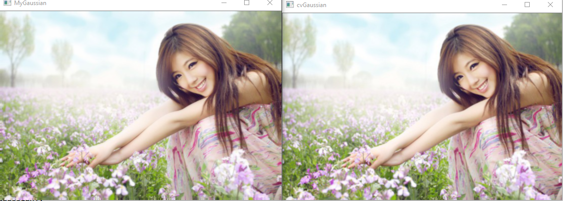 下圖是自己實現的高斯濾波器和OpenCV中的GaussianBlur的結果對比
