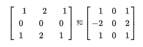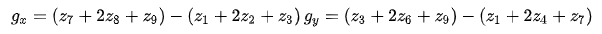 第(di)一(yi)個模(mo)板,第(di)三行和第(di)一(yi)行的(de)差近似x方向(xiang)的(de)偏微分(fen);第(di)二個模(mo)板,第(di)三列和第(di)一(yi)列的(de)差近似y方向(xiang)的(de)偏微分(fen),而且模(mo)板的(de)所有系數只(zhi)和為(wei)0,表示恒定灰度區域的(de)響應(ying)為(wei)0.