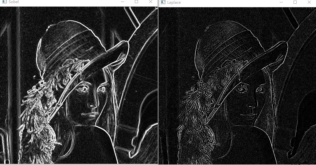 在OpenCV中有對LapLace的封裝,其函數為Laplacian,其使用的模板中心的系數為負,具體參數說明參見OpenCV文檔,其得到的邊緣圖和一階微分算子得到邊緣圖對比結果如下: