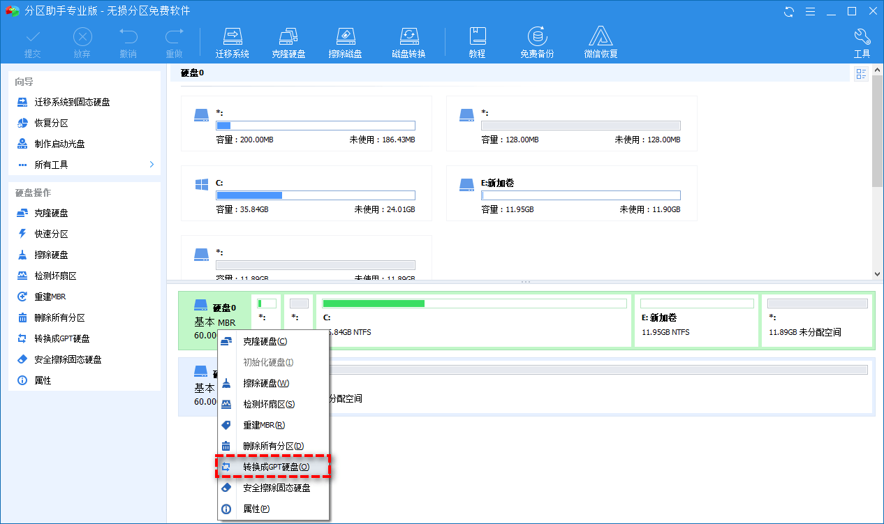 3、打開分區(qu)助手,選中(zhong)你的磁盤右(you)鍵(jian)“轉換成GPT”,如(ru)果你電(dian)腦(nao)只有一塊硬(ying)盤,那就(jiu)選它就(jiu)完事(shi)了,如(ru)果多塊,找到你引導項所(suo)在的硬(ying)盤
