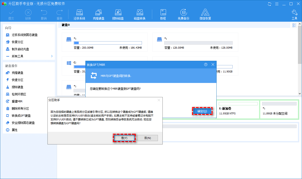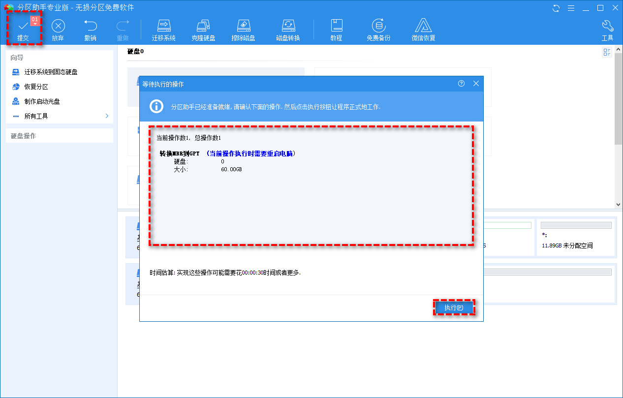 5、返回主(zhu)界(jie)面,單擊左上角“提交”按鈕(niu)以(yi)預覽即將進行的任務,確認無誤后單擊“執行”以(yi)開始將MBR轉換成GPT磁盤