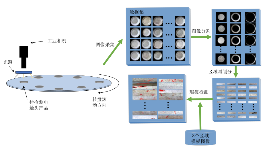 金屬產品在轉盤上按一定方向轉動,當其位于攝像頭下方時進行圖像采集,原始圖像是由工業相機在平行光(guang)源下成(cheng)像獲得,采集(ji)的圖(tu)像構成(cheng)數據集(ji)。由于現(xian)場拍(pai)攝到的(de)(de)金屬工件圖(tu)像受打光不均、污漬灰(hui)塵、機械裝置震(zhen)動等(deng)因素的(de)(de)影響(xiang),拍(pai)攝到的(de)(de)原始圖(tu)像往(wang)往(wang)背(bei)景不夠(gou)單純(chun),含有各類干擾(rao),導致圖(tu)像特征提取困(kun)難。加之(zhi)工業環境(jing)相(xiang)對(dui)較為(wei)復雜,空氣中的(de)灰塵、細(xi)小(xiao)纖維以及生產(chan)環節的(de)殘留的(de)水汽,油漬等(deng)難免會進(jin)入到相(xiang)機(ji)拍攝范(fan)圍內,對(dui)瑕疵檢測造成一(yi)定(ding)的(de)干擾(rao),因此有必要對(dui)采集到的(de)圖像(xiang)(xiang)進(jin)行預(yu)處理(li),以排(pai)除干擾(rao)將圖像(xiang)(xiang)轉換為(wei)更適合后續(xu)特征提取(qu)的(de)形式。通過圖像(xiang)(xiang)預(yu)處理(li)也可以減少圖像(xiang)(xiang)處理(li)時(shi)間,提供(gong)更高的(de)識別(bie)精度。