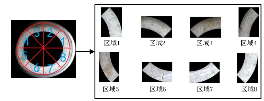 光(guang)照(zhao)并(bing)非(fei)均勻照(zhao)射到整(zheng)個金屬產品表(biao)面,但光(guang)照(zhao)過渡較為平緩。為減弱光(guang)照(zhao)不均的影響,便于后續特征提取環節,本次使用8個扇形掩(yan)膜將光(guang)滑區域和(he)外(wai)圓(yuan)區域平均分成(cheng)8個區域,對(dui)應于編(bian)號1-8。