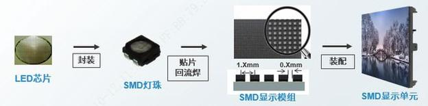 SMD技術路線是將(jiang)發光芯片(晶圓(yuan))封(feng)裝成燈珠,把燈珠焊(han)接到PCB板上形成單元(yuan)模組,最(zui)后拼接成一(yi)整塊LED屏;