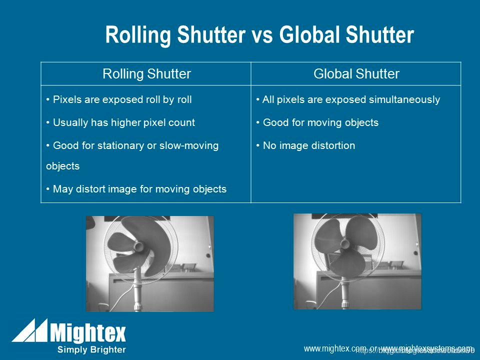 與Global shutter不同,它是通過Sensor逐行曝光的方式實現的。在曝光開始的時候,Sensor逐行掃描逐行進行曝光,直至所有像素點都被曝光。當然,所有的動作在極短的時間內完成。不同行像元的曝光時間不同。Globalshutter 曝光時間(jian)更短(duan),但(dan)會增加讀出噪聲(sheng);