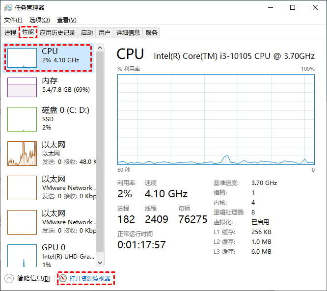 3.然后點(dian)擊(ji)性能選項,再點(dian)擊(ji)CPU,然后點(dian)擊(ji)下方的打(da)開資源監控器(qi)。