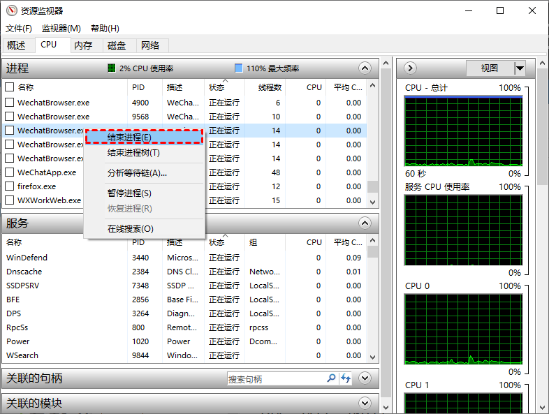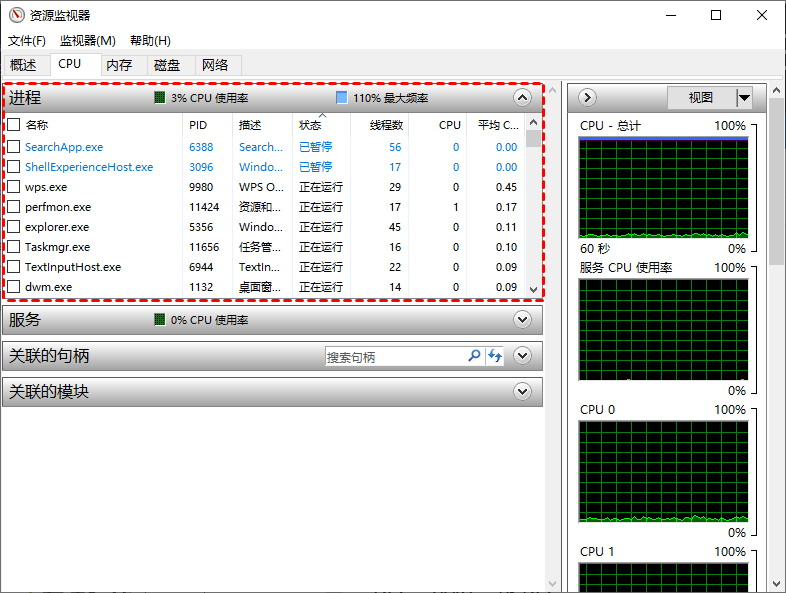 4.進入資源監視器后,點擊CPU選項(xiang),就可以看(kan)到現在正在運(yun)行(xing)的程序了。