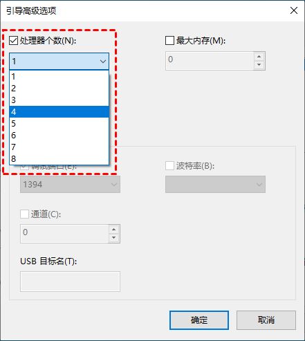 3.點擊處理器個數下方(fang)的(de)選項框,選擇大的(de)數字,再點擊確定。