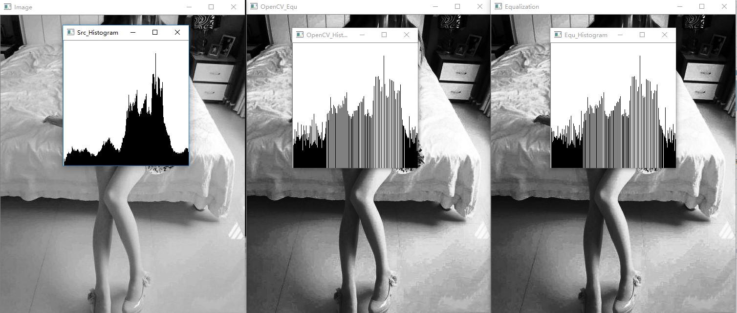 上面代碼只是加深下對均衡化算法流程的理解,實際在OpenCV中也提供了灰度均衡化的函數equalizeHist,該函數的使用很簡單,只有兩個參數:輸入圖像,輸出圖像。下圖為,上述代碼計算得到的均衡化結果和調用equalizeHist的結果對比