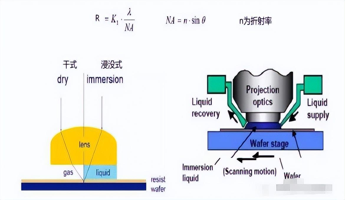 傳統的光(guang)刻(ke)技(ji)術(shu)中鏡頭和晶圓(yuan)之間(jian)的介質是空(kong)氣(qi),而浸(jin)潤式光(guang)刻(ke)技(ji)術(shu)則是把空(kong)氣(qi)換成了液(ye)體(ti),比如(ru)水,這是利用了光(guang)通過(guo)液(ye)體(ti)后波長縮短(duan)從而提(ti)高分辨率的原理。