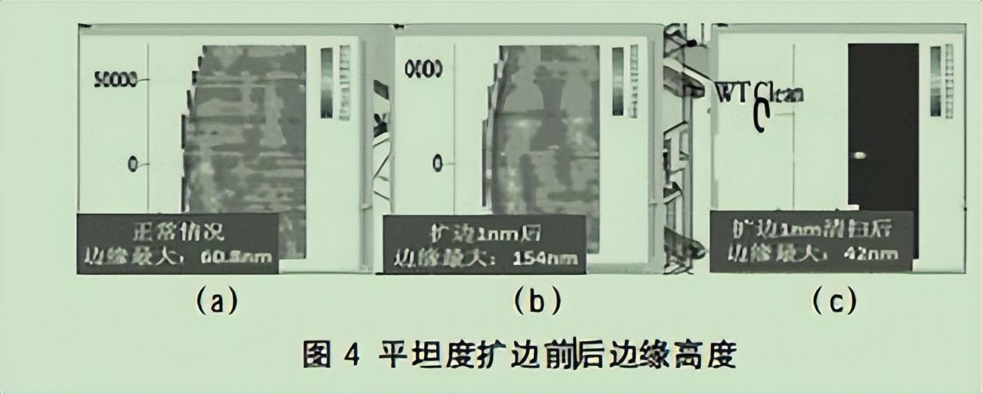 在正常狀態下(xia),如圖(tu) 4(a),平坦度最(zui)大值為 60.8 nm,而當我們擴(kuo)邊(bian)以(yi)后(hou),如圖(tu) 4(b),發現邊(bian)緣出現了紅色點,最(zui)大值達(da)到 154 nm,而經(jing)過清掃后(hou)邊(bian)緣結果變好,如圖(tu) 4(c)。
