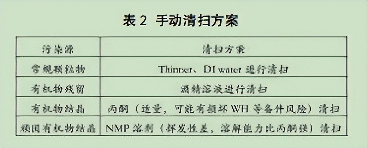 曝光臺清掃(sao)(sao)分為自(zi)動(dong)清掃(sao)(sao)和手(shou)動(dong)清掃(sao)(sao)兩種(zhong),經過長期的(de)(de)清掃(sao)(sao)經驗積累,針對不同的(de)(de)污(wu)染源,我們(men)制定了不同的(de)(de)手(shou)動(dong)清理(li)方案,如表2 所(suo)示。