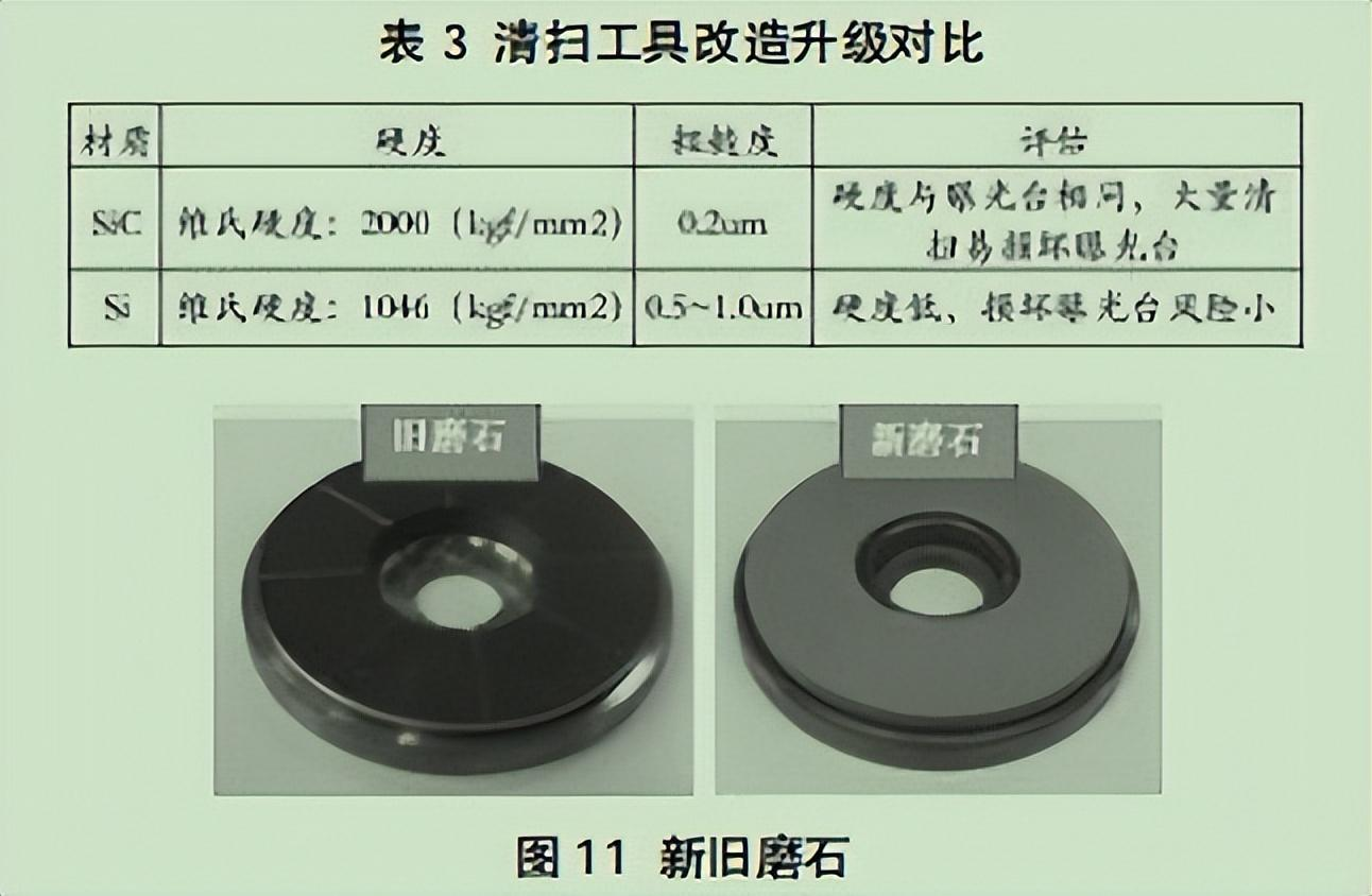 同時針(zhen)對(dui)(dui)清掃(sao)工具,我(wo)們和廠商(shang)研究討論,對(dui)(dui)傳統的(de)清掃(sao)材質進行了升級改進,降低(di)了曝光臺的(de)損壞率,延(yan)長了關鍵部品的(de)壽命,節省了成(cheng)本,改造前后對(dui)(dui)比如(ru)表 3 所示(shi),新(xin)舊磨石(shi)如(ru)圖(tu) 11 所示(shi)。