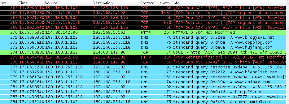 封包(bao)列(lie)表的(de)面(mian)板中顯示(shi),編號,時間戳,源地址,目(mu)標地址,協議,長度(du),以及封包(bao)信息。 你(ni)可以看到不(bu)同(tong)的(de)協議用了不(bu)同(tong)的(de)顏色顯示(shi)。