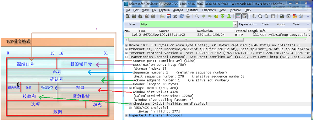 從(cong)下圖(tu)可以看到wireshark捕獲到的(de)TCP包中的(de)每個字段(duan)。
