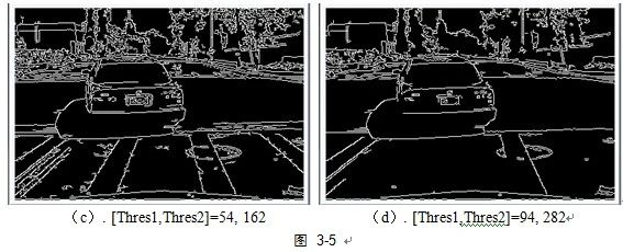 如圖(tu) 3?5所示,(a)為(wei)原圖(tu)的(de)灰度圖(tu),(b)為(wei)高斯濾波(bo)平滑圖(tu),(c)和(d)分(fen)別(bie)是手動設置的(de)高低門(men)限(xian)值如圖(tu)所示的(de)canny邊緣檢(jian)測結果。根(gen)據多組圖(tu)像數(shu)據測試發現(xian),當canny高低門(men)限(xian)值分(fen)別(bie)設置為(wei)50,150時能夠(gou)保證大部分(fen)有效信息的(de)保留且不會有過多冗余信息。因此后文中采(cai)用門(men)限(xian)值[Thres1,Thres2]= 50,120 作為(wei)canny邊緣檢(jian)測參數(shu)。Opencv中以下(xia)代(dai)碼實現(xian):