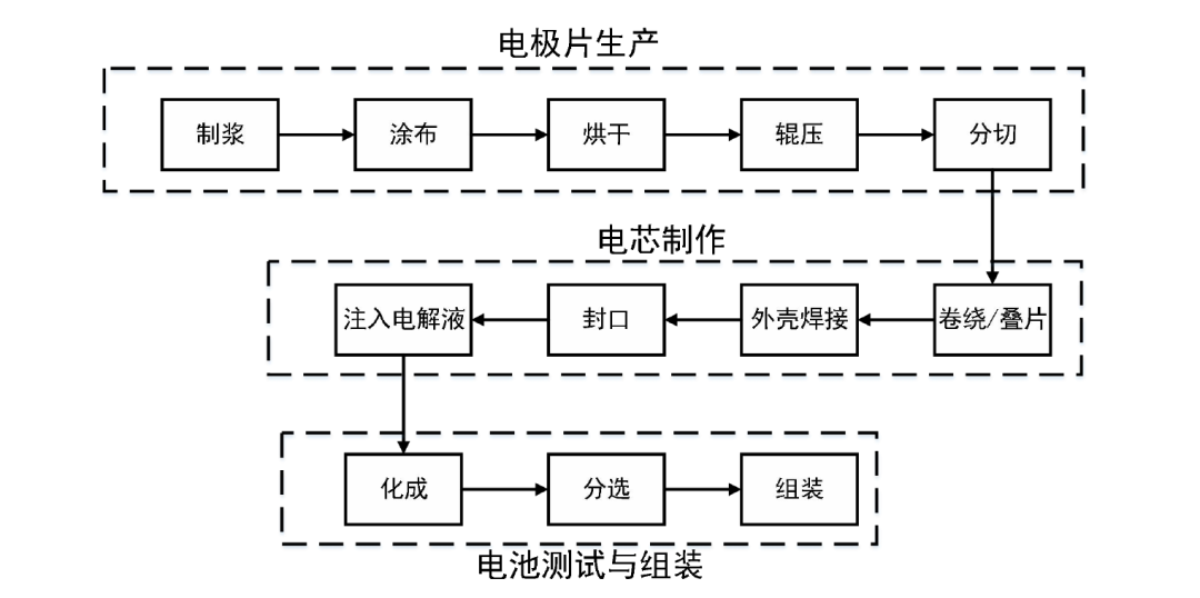 在(zai)實際工(gong)業生(sheng)(sheng)產(chan)中,鋰離子電(dian)池的生(sheng)(sheng)產(chan)過程主要可分為三(san)大(da)階(jie)段(duan):電(dian)極片生(sheng)(sheng)產(chan)階(jie)段(duan),電(dian)芯制作階(jie)段(duan)和電(dian)池測(ce)試(shi)與(yu)組裝階(jie)段(duan),而每一階(jie)段(duan)又包含多道工(gong)藝步(bu)驟。