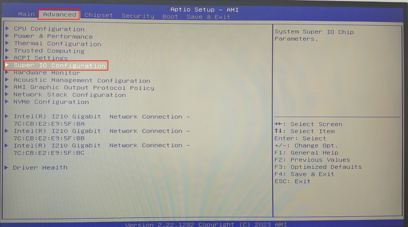 a.進入BIOS選(xuan)擇“Advanced”頁面中,選(xuan)擇“Super IO Configuration”