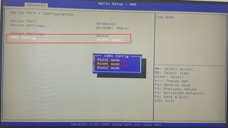 b.選(xuan)擇“com1”所在的選(xuan)項,回車,選(xuan)擇“RS485 mode”模式,回車,按“F4”保存退(tui)出