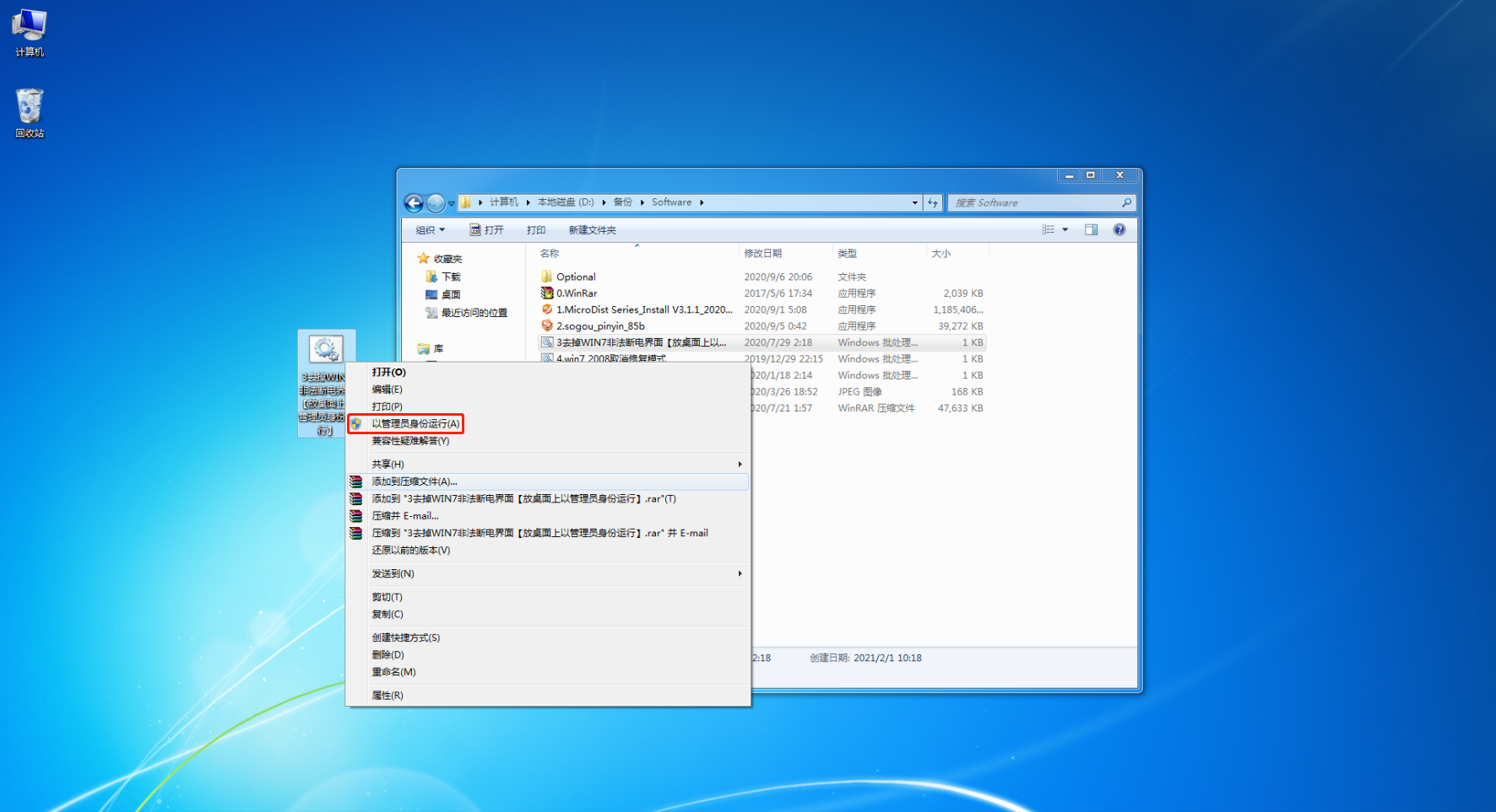 右鍵單(dan)擊(ji)“4去掉WIN7非法斷(duan)電界面【放(fang)桌面上(shang)以管理員身份運行】.bat”文件。