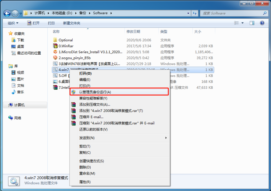 右鍵單擊文件(jian)“4.win7 2008取消修復模式(shi).bat”。