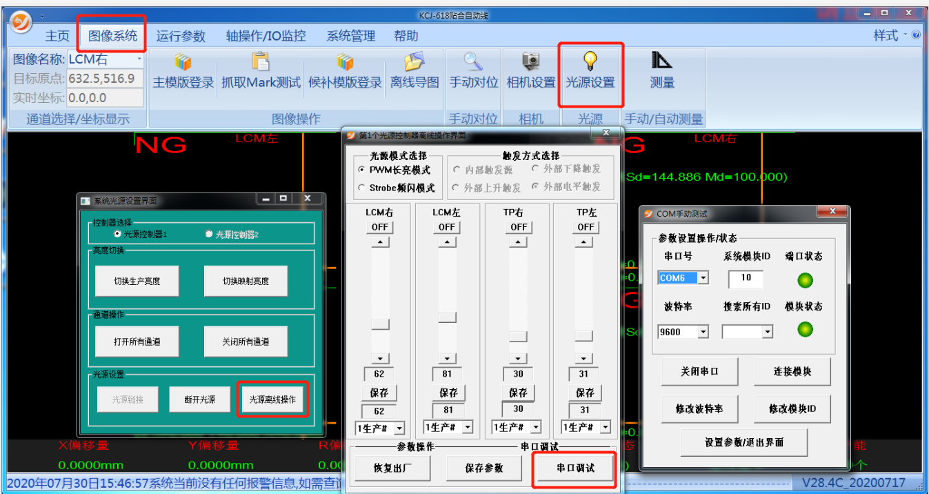 →將光(guang)(guang)源連(lian)接(jie)到光(guang)(guang)源控(kong)制(zhi)器(qi)上,點(dian)擊圖中(zhong)(zhong)⑧所在(zai)區域中(zhong)(zhong)的按鈕及滑塊控(kong)制(zhi)光(guang)(guang)源開關及亮滅,確認(ren)光(guang)(guang)源控(kong)制(zhi)器(qi)無異常(chang),如果異常(chang)請(qing)找技(ji)術確認(ren)問(wen)題并(bing)解決(jue)。