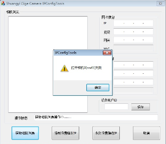 3) 點擊“獲取相(xiang)機列表(biao)”,會彈出打開(kai)相(xiang)機失(shi)敗以及請確(que)認網卡(ka)IP地址(zhi)和相(xiang)機地址(zhi)是否匹配(pei)。