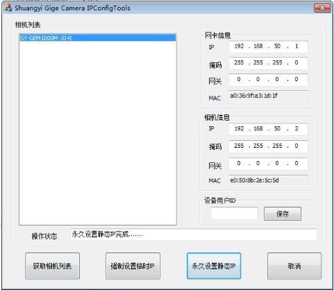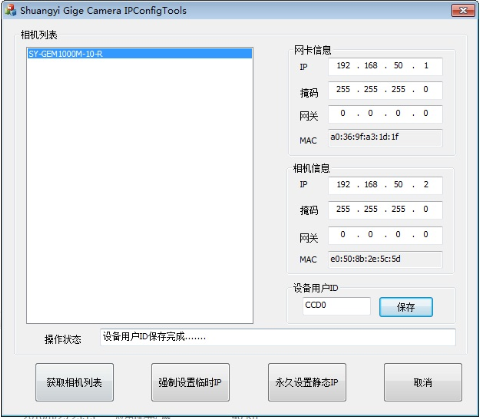 5) 填寫相機IP地址(默認192.168.50.2為CCD0,192.168.51.2為CCD1,以此類推),點(dian)擊(ji)強制設(she)置臨(lin)時(shi)(shi)IP,系統會顯示(shi)強制設(she)置臨(lin)時(shi)(shi)IP完成……