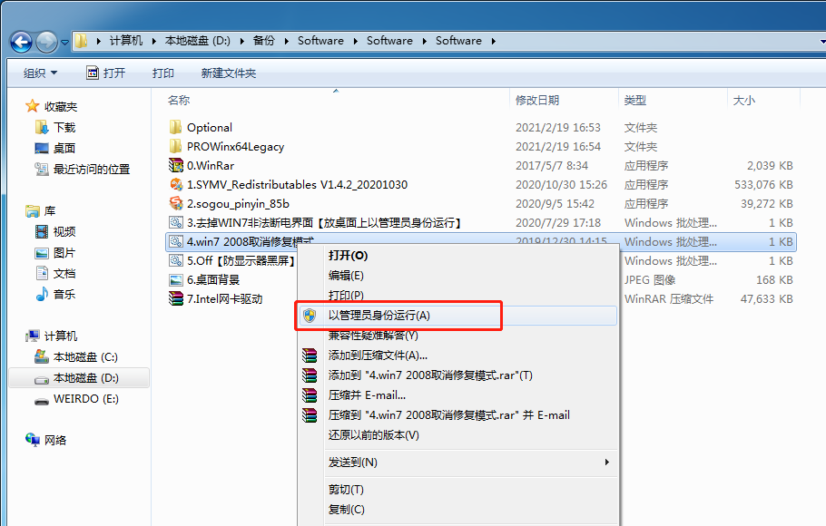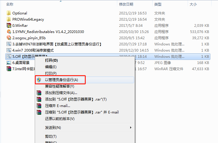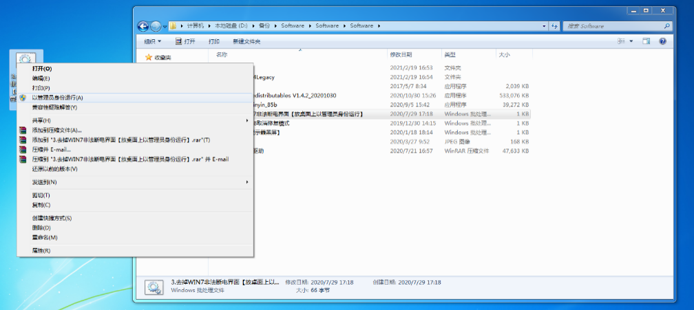 右鍵(jian)單擊“4去(qu)掉WIN7非法斷電(dian)界面(mian)【放桌面(mian)上以管理員身份運行】.bat”文(wen)件。