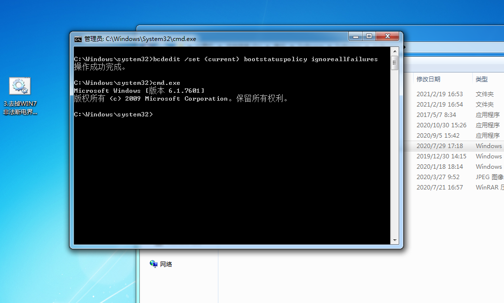 將文件“4去掉WIN7非法斷電界面【放桌面上以管理員身份運行】.bat”拷貝到桌面。