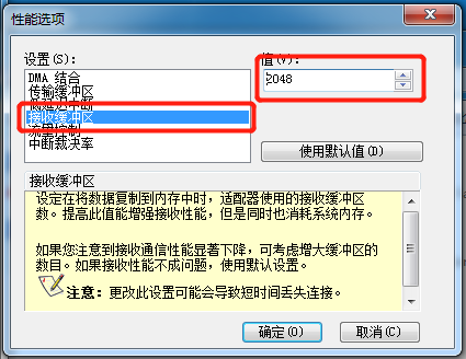 →點擊“高級”選項卡中的“性能選項”,點擊屬性,將“傳輸緩沖區”的值修改為最大值,圖中最大值為“2048”