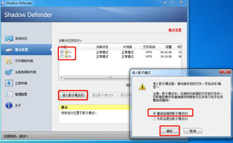 →點(dian)擊“重啟后繼續(xu)影子(zi)模式”