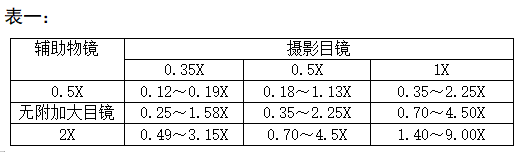 光學放(fang)大(da)倍率(lv) = 變倍主物鏡放(fang)大(da)率(lv)(0.7X~4.5X)×攝影目(mu)鏡放(fang)大(da)率(lv)×附加大(da)物鏡放(fang)大(da)率(lv)(見(jian)表一)