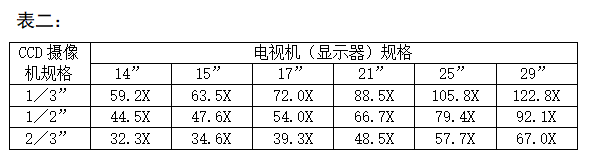 數字放大(da)倍(bei)數 = 監視器(qi)尺(chi)寸 * 25.4/CCD或CMOS靶面尺(chi)寸(即對角線(xian)尺(chi)寸大(da)小) ;(1英寸=25.4mm)(見表二)