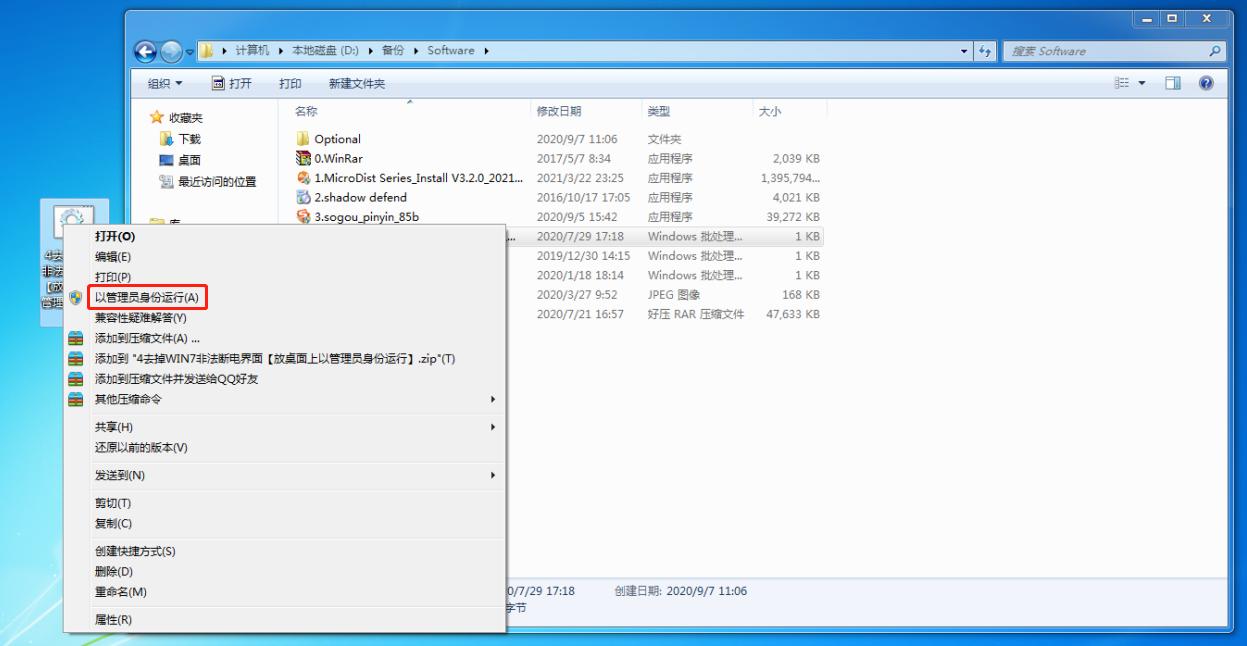 右鍵單擊“4去掉WIN7非法斷(duan)電界面【放桌面上(shang)以管理員身份運行】.bat”文件。