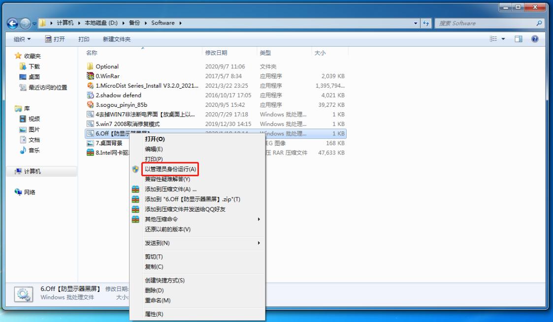 右鍵單(dan)擊文件“6.Off【防顯(xian)示器黑屏】.bat”。