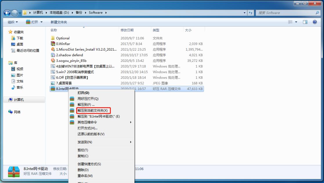 右鍵單擊文件“8.Intel網卡驅(qu)動(dong).rar”。