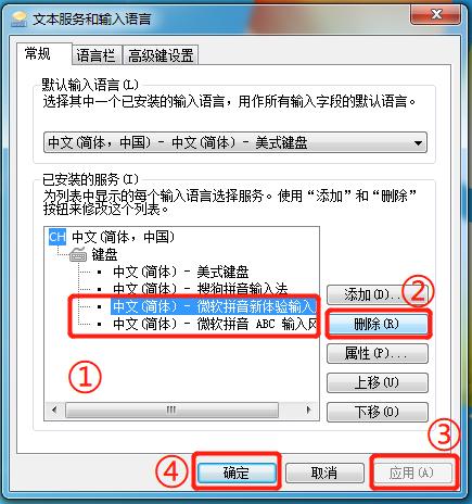 選(xuan)中(zhong)不(bu)需要的輸入法,點擊“刪除”→“應用”→“確(que)定”
