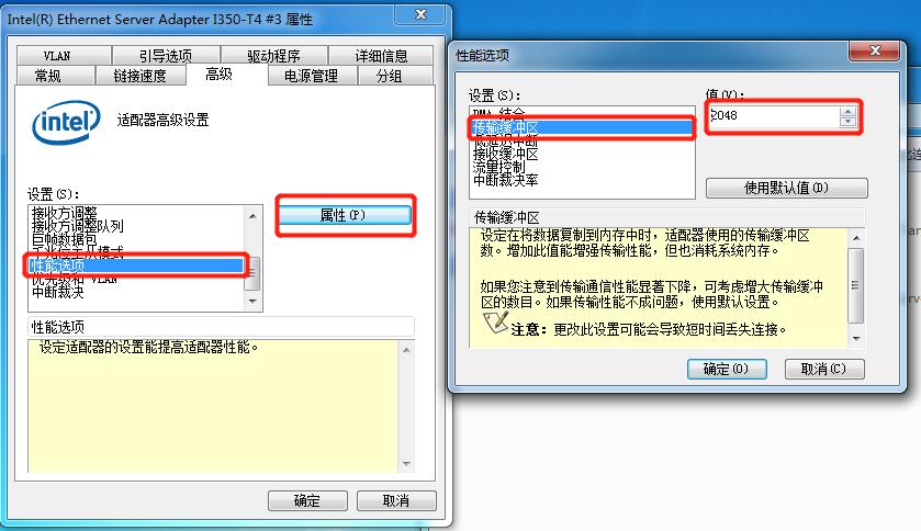 →點(dian)擊“高級”選(xuan)項卡中的“性能(neng)選(xuan)項”,點(dian)擊屬性,將(jiang)“傳(chuan)輸緩沖(chong)區(qu)”的值(zhi)修改為最(zui)大值(zhi),圖中最(zui)大值(zhi)為“2048”