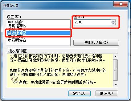→將(jiang)“接(jie)收緩沖區”的(de)值修改為(wei)最(zui)大(da)值,圖中(zhong)最(zui)大(da)值為(wei)“2048”
