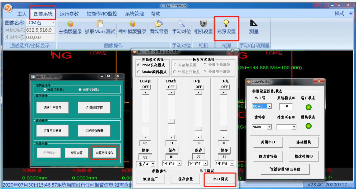 →將光源(yuan)連接(jie)到光源(yuan)控制(zhi)器(qi)上,點擊(ji)圖中⑧所在區域中的(de)按鈕及(ji)滑塊控制(zhi)光源(yuan)開關(guan)及(ji)亮滅,確(que)認(ren)光源(yuan)控制(zhi)器(qi)無(wu)異(yi)常(chang),如果(guo)異(yi)常(chang)請找技(ji)術(shu)確(que)認(ren)問題并解決。