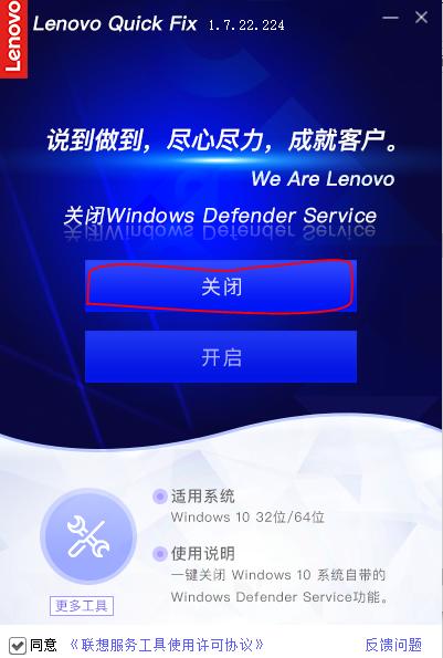 雙擊運行“關閉Windows Defender Service工具”程序,點擊“關閉”,