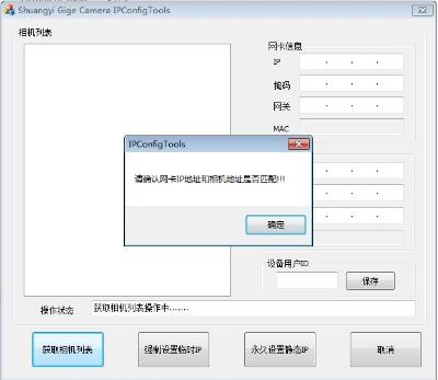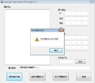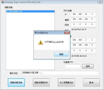 3) 點擊“獲(huo)取相(xiang)機列表”,會彈出(chu)打開相(xiang)機失敗(bai)以及請確(que)認網卡(ka)IP地址和(he)相(xiang)機地址是否匹配。