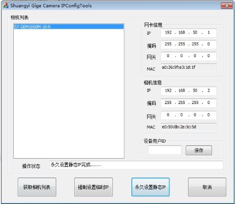 5) 填寫相機IP地址(默認192.168.50.2為CCD0,192.168.51.2為CCD1,以此類推),點(dian)擊強(qiang)(qiang)制(zhi)設置臨(lin)時IP,系統會顯示強(qiang)(qiang)制(zhi)設置臨(lin)時IP完成(cheng)……