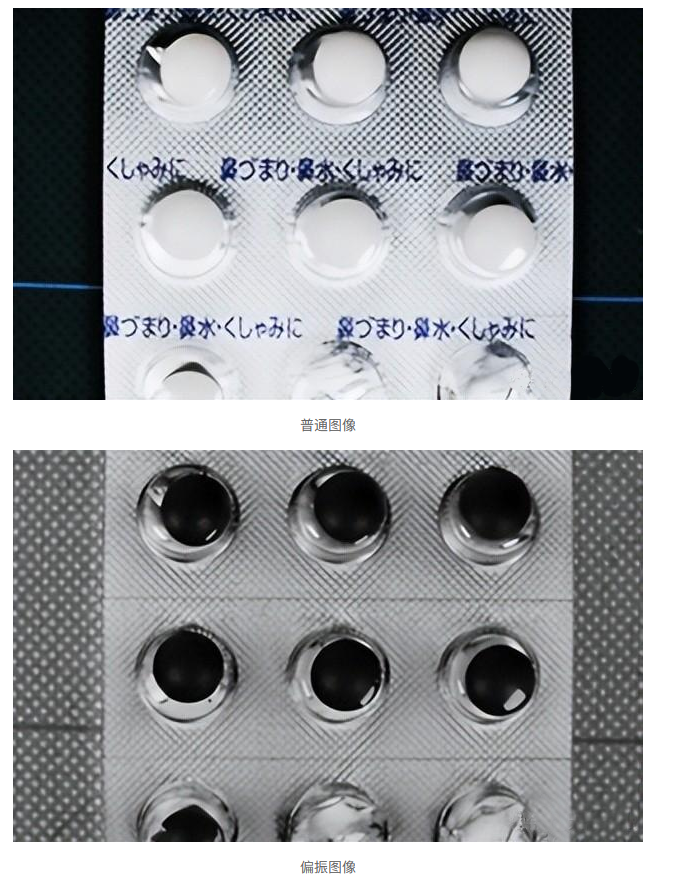藥片泡(pao)罩包裝的(de)塑料反光常掩蓋內部(bu)藥片,但利用偏振成像增強對比度(du)后,缺失的(de)藥片在(zai)圖像中清(qing)晰可辨