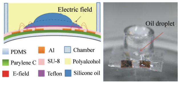 電潤(run)濕技(ji)術(EWOD)通過改(gai)變液滴與固體(ti)表面(mian)間的(de)接(jie)觸角(jiao)實現(xian)曲(qu)率(lv)調控,是(shi)目前最(zui)成熟(shu)的(de)液態鏡頭技(ji)術。具有響(xiang)應速度快(毫(hao)秒(miao)級)、功耗低(di)、重(zhong)復性好的(de)特點,已廣泛(fan)應用于工(gong)業相機和(he)自(zi)動化檢測(ce)設備(bei)。