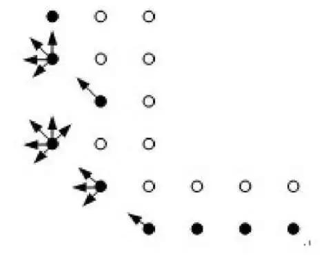 跟蹤準則:按起始點選取準則找到最左下方位的邊界點后,以其為起始點,定義左上方為初始搜索方向,若該方向的點為黑點(特征點),則判其為邊界點,否則沿順時針方向旋轉搜索方向45度,依此類推,直到搜索到第一個黑點(特征點)為止,然后再把該黑點(特征點)作為新的邊界點,逆時針方向旋轉當前搜索方向90度,用相同的方法繼續搜索下一個黑點(特征點),直到找到初始邊界點為止。若用箭頭表示搜索方向,那么該輪廓跟蹤算法可以用圖表示。
