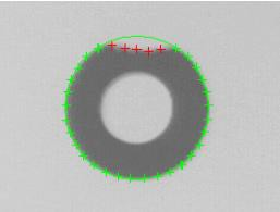 差(cha)異點是遠(yuan)離有效點集合(he)的(de)點,它的(de)出現會影響(xiang)形(xing)(xing)狀(直(zhi)線、圓、矩(ju)形(xing)(xing))的(de)逼近程度,需(xu)要將其剔(ti)除。下(xia)圖(tu)所示為剔(ti)除圓上的(de)差(cha)異點:
